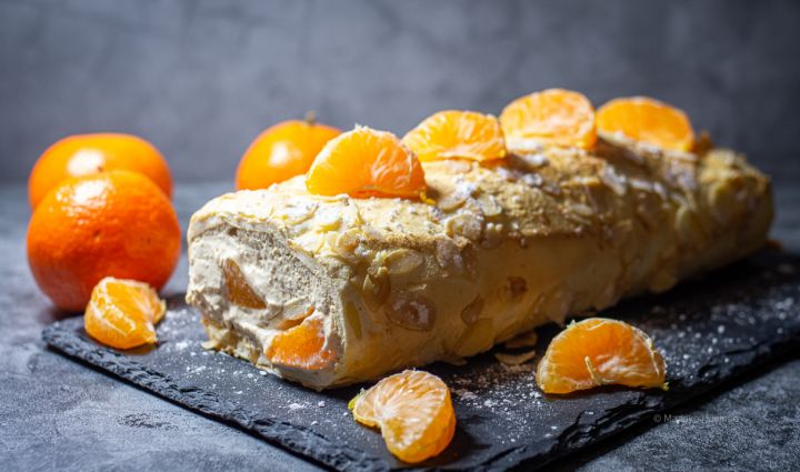 Kata besee kohupiimakreemiga (jäta äärtesse veidi tühja ruumi,et täidis rulli keerates välja ei hakkaks pressima) ning lao peale mandariiniviilud. Keera beseeplaat pikemast servast küpsetuspaberi abil rulli.